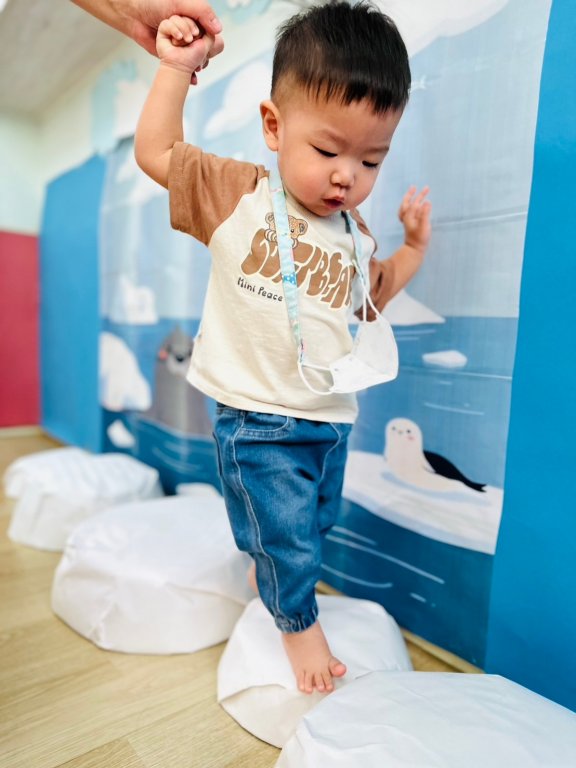 將感統器材(河石)變成了雪地請孩子跟企鵝走在雪地裡呢~此活動可增進孩子的平衡感、腳底觸覺、促進動作協調性唷!