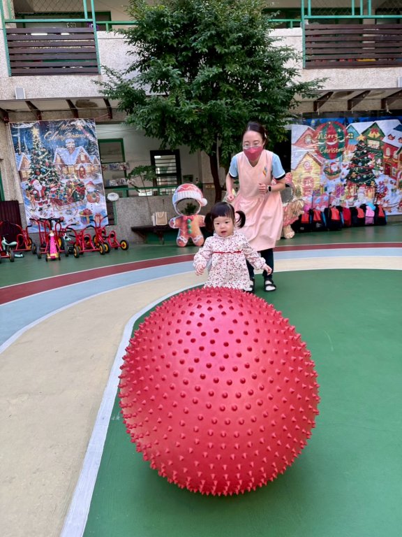 今天我們在操場進行「跑步與追大龍球」的戶外活動。老師先帶孩子們到操場集合,並說明今天要一起跑步、追球。老師拿出大龍球,輕輕推動讓孩子觀察球滾動的方向,並提醒:「等一下我們要一起跑一跑,追龍球喔!」孩子在老師引導下,能觀察球的方向並開始追逐大龍球,老師也口語提示:「大龍球在哪裡?我們跑一跑去追球球。」活動中,孩子們表現得很開心,透過這項活動,孩子不僅練習跑步,也提升大肌肉協調與動作控制能力。