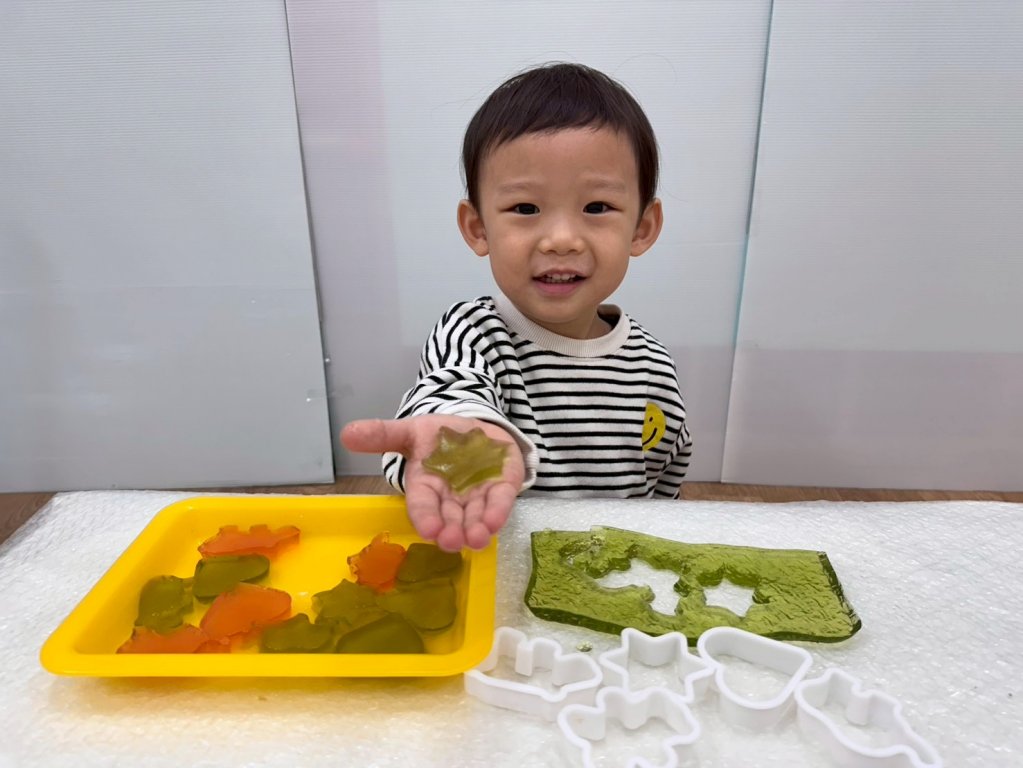 今天我們進行了「小廚師」的主題活動。老師帶孩子認識各種甜點的製作方式,接著請孩子摸摸由菜燕和食用色素做成的果凍,感受軟軟、涼涼的觸感。之後,老師示範如何把模型模具放在果凍上輕輕一壓,做出不同形狀的小甜點。在老師的引導下,孩子們也將自己的模具放在果凍上壓一壓,老師再協助孩子脫模。孩子們能自行選擇自己喜歡的形狀,並說說看壓出了什麼樣的圖案。透過今天的活動,孩子不但體驗到不同的感官刺激,也練習了手部精細動作,同時提升了語彙表達能力。