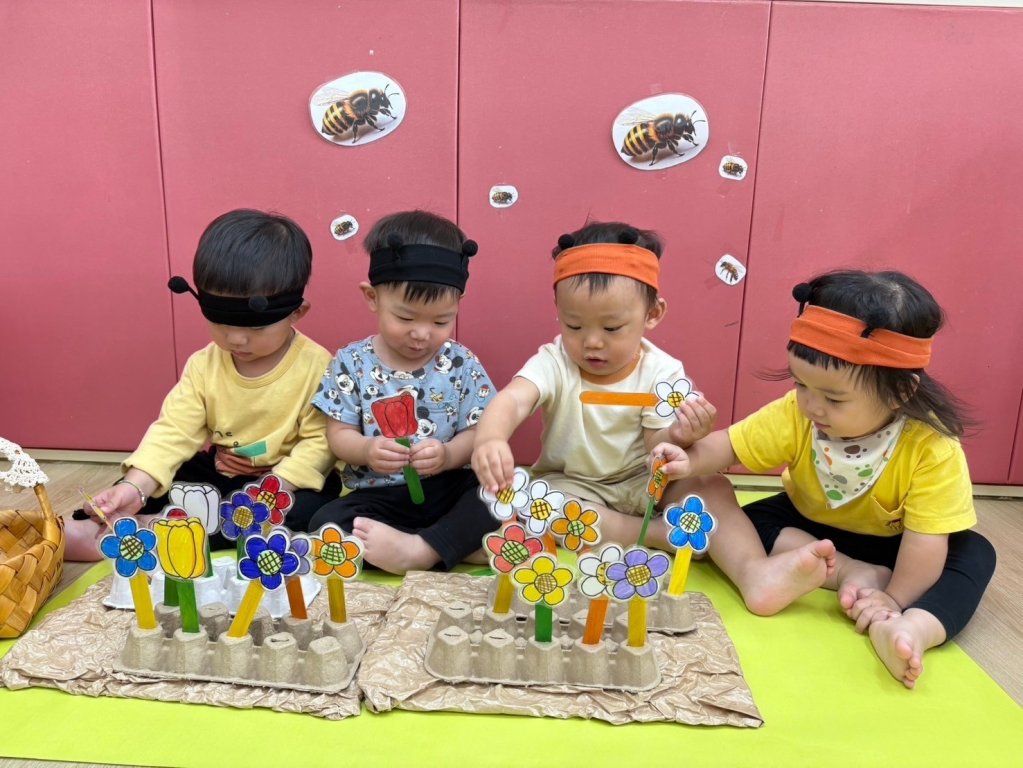 可愛小蜜蜂登場!老師運用繪本『花開了!』請孩子找一找有什麼昆蟲在花朵上,接著,老師拿出自製教具,讓孩子變成一隻小蜜蜂,將花朵棒拿下來,並放入花籃裡唷!春天來了,爸媽在假日時帶著孩子到戶外走走親近大自然,透過觀察或許能看見可愛的昆蟲唷!