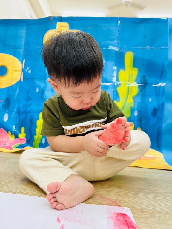 請孩子用腳踩踩顏色印泥~感受到印泥觸感~老師將孩子們的腳印剪下後,變成一個可愛的海星