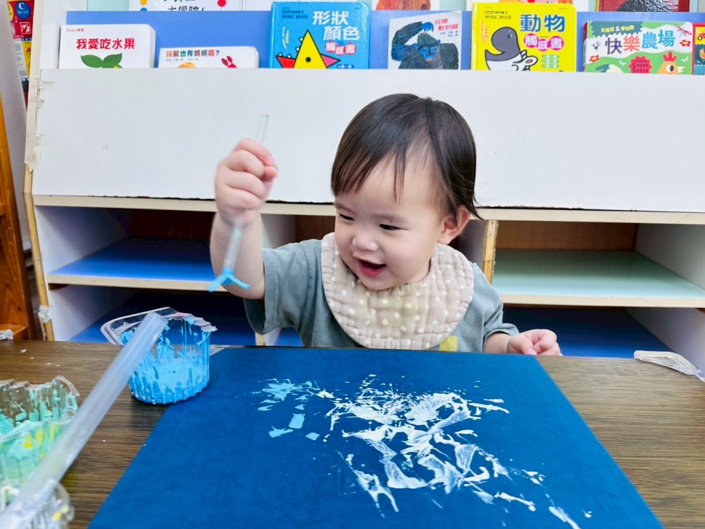 老師準備吸管與顏料,先示範如何將吸管一端沾上顏料,再將吸管輕輕蓋在藍色紙上,孩子嘗試將吸管放入顏料中,再自己蓋到紙上,顏色逐漸呈現出像煙火般繽紛的畫面。孩子在過程中體驗沾、蓋、觀察印痕的變化,享受創作的樂趣。