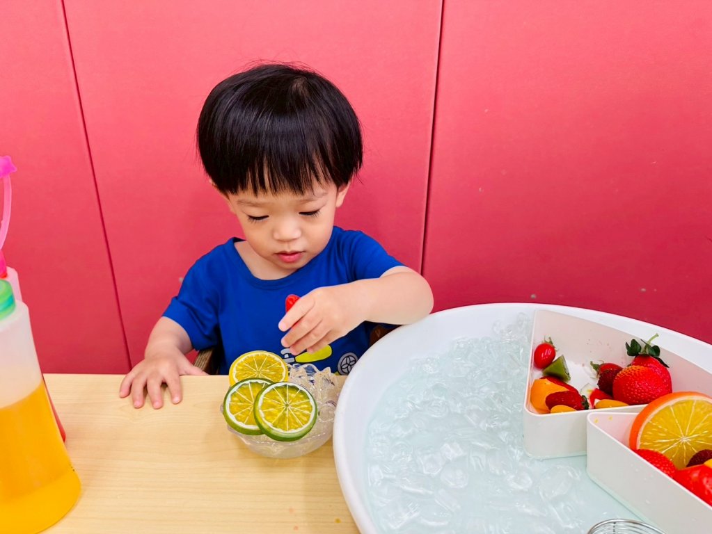 本週帶孩子體驗不同的觸覺刺激,配合主題老師設計『水果挫冰』,孩子使用湯匙小心翼翼舀起冰塊,或是伸出手去嘗試,感受冰塊在手掌上冰冰涼涼,孩子充滿好奇目,冰塊的冷、硬、滑、融化變成水,給於孩子豐富的觸覺經驗,有助於感覺統合的發展唷~