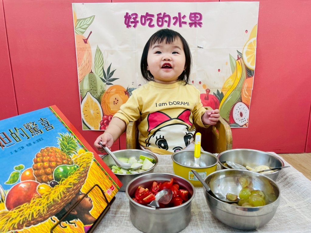 本月是水果主題讓孩子認識水果自己拿湯匙舀水果放進碗裡再好好品嘗水果的好滋味