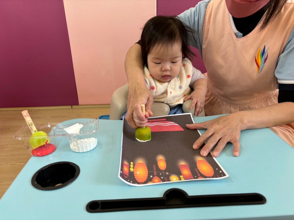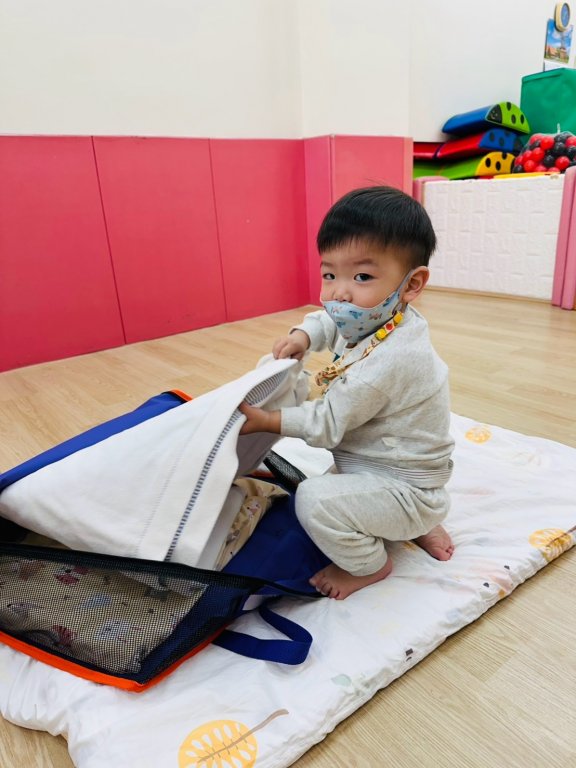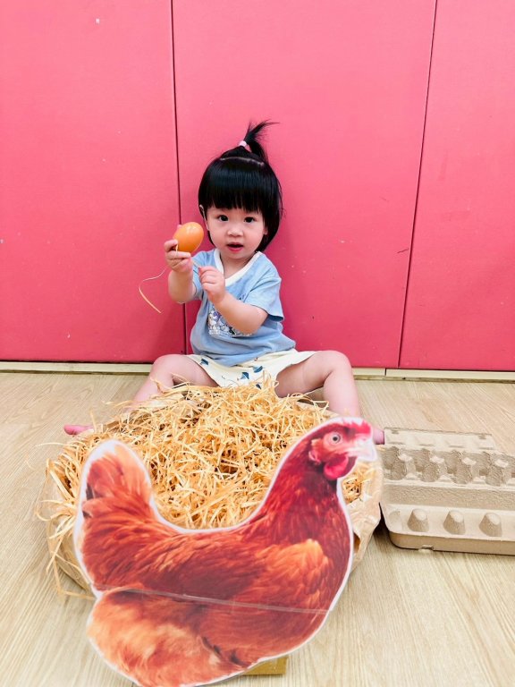 本週讓孩子體驗撿雞蛋的樂趣!老師在感官盆裡放滿了包裝紙絲和模型雞蛋,營造出雞舍裡的雞窩,請孩子試著從包裝紙絲裡找出雞蛋,並放入雞蛋盒裡,孩子們感到很新奇呢!