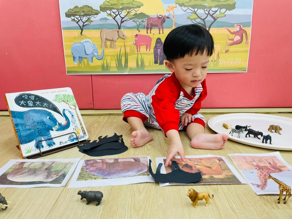 本月是動物主題,老師藉由繪本來認識動物再搭配動物模型讓孩子可以加深印象,每隻動物的影子也都長的不一樣,讓孩子自己探索依據動物輪廓尋找相應的動物,此活動可培養孩子觀察的能力和專注力,假日不妨帶孩子到戶外走走增加生活經驗吧!